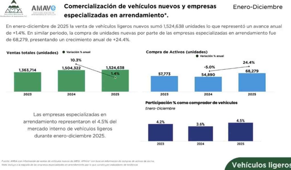 Durante la presentación de resultados, representantes de ambas organizaciones destacaron que la venta total de vehículos ligeros nuevos en México alcanzó 1,524,638 unidades. Lo que representó un crecimiento anual moderado de 1.4%. Sin embargo, la compra de unidades por parte de empresas de arrendamiento mostró un dinamismo muy superior, al registrar 68,279 unidades. Equivalente a un crecimiento anual de 24.4%.