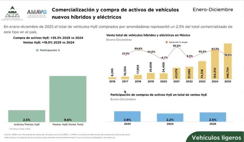 Otro de los focos del reporte fue el avance de vehículos híbridos y eléctricos. En 2025 se comercializaron 146,728 unidades electrificadas, equivalentes al 9.6% del mercado total, con un crecimiento anual del 18%.