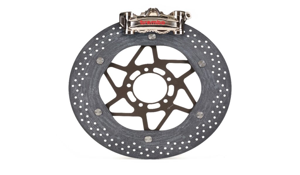 Mientras tanto, el sistema se complementa con un disco trasero flotante de acero y campana de aluminio. A diferencia de soluciones convencionales, Brembo utiliza casquillos de aluminio para reducir la masa total.