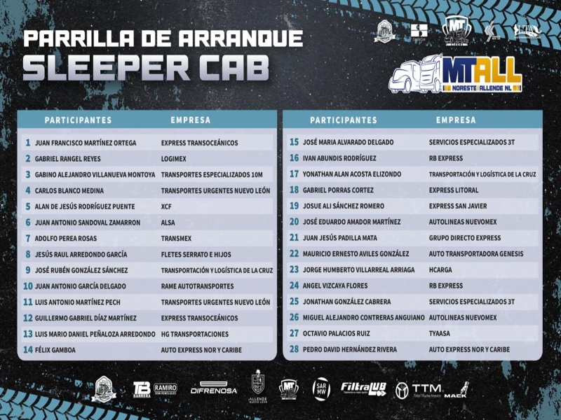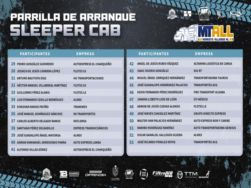 Por un lado, la categoría Sleeper Cab contará con 53 operadores. En este grupo, Juan Francisco Martínez Ortega, de Express Transoceánicos, abrirá la competencia. Posteriormente, José Ricardo Perales Reyes, de Transportes ACG, cerrará la jornada de esta categoría.